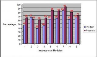 Impact on Student Learning One year ago, student outcomes were measured by grades on hand written lab reports and on the final exams. Although on average students graded B-, they had problems with execution of the laboratory procedures and data analysis. Today, student outcomes are measurable by grades on electronic format lab reports and on the final exams, group oral presentations, student satisfaction surveys, assessment on gains between pre and post test results and instructor's critical observations. The use of the modules and the ink technology has improved student outcomes, as evidenced by: 1) better execution during the laboratory procedures, 2) improvement in the results generated by the data obtained, 3) better analysis and discussions of the end-results on student laboratory reports, 4) better scores in the post-tests as compared to the pre-tests (see graphic above), 5) improved quality of PowerPoint group oral presentations by including multimedia tools such as animations, computer simulations and video clips, among others. The survey results evidenced the students satisfaction with the Tablet PCs Technology as a research tool to obtain more information to solve the problems they encounter in the development of a particular technique and to develop numerical and graphical analysis. These outcomes suggest that students are developing a good understanding of the laboratory techniques and their applicability to research and industrial work. One year from know, student outcomes will be measurable by electronic format lab reports, computer base final exams, group oral presentations, student satisfaction surveys, assessment pre and post-test results, and instructor's critical observations. My goals will be to improve student critical thinking, selfconfidence, and basic science related computer skills. I also expect to improve on student and faculty course management.