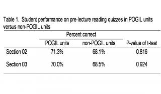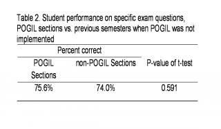 II. Impact of POGIL on Learning Outcomes Student performance on specific exam questions dealing with subject matter covered using POGIL was also compared to previous semesters when POGIL was not applied and results are presented in Table 2. As indicated in Table 2, students appeared to perform slightly better on exam questions when POGIL was used as a pedagogy; however, the difference is not statistically significant.