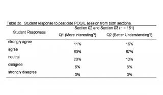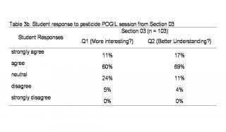 III. Student feedback on POGIL Student feedback on each POGIL session was solicited through anonymous clicker responses during the following class period. Students were asked to respond to two questions: Q1: "The pesticide (or biodiesel) activity we performed in class last week helped make the material in this unit more interesting." and Q2: "The pesticide (or biodiesel) activity we performed in class last week helped me better understand some of the concepts in this unit." Students used their clicker to respond as "strongly agree", "agree", "neutral", "disagree" or "strongly disagree". Student response to the pesticide POGIL session is summarized in Table 3a-c below.