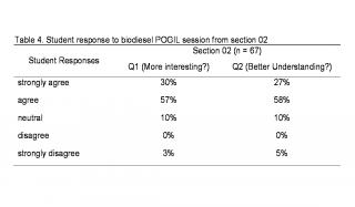 As indicated in Table 3a-c, student reaction to pesticide POGIL is positive. About three quarters of students either agreed or strongly agreed that the unit helped make the material more interesting, and helped them better understand some of the concepts in the pesticide unit. Student response to biodiesel POGIL session is summarized in Table 4 below (only from section 02, data for the other section is lost due to technical problem with clicker software).