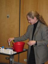 Jo Handelsman from the University of Wisconsin, Madison. Jo gave a talk entitled: "Scientific Teaching: Why and How We Need to Reform Science Education" on Thursday January 29th, 2004. Jo spoke about the data supporting the need for educational reform and some of the projects she has been working on to increase student involvement in their own learning. Jo also performed an exciting experiment demonstrating the icenucleating abilities of a bacteria.